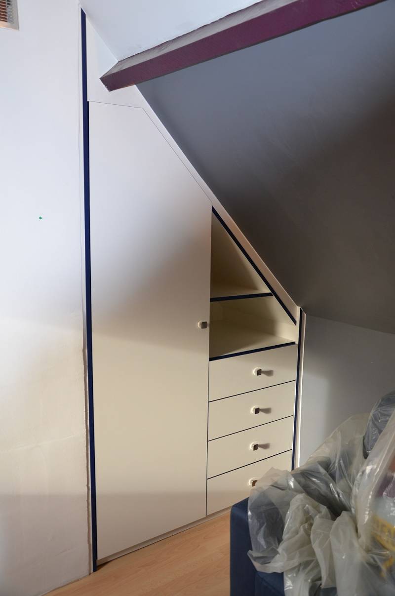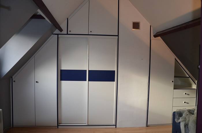 dans une maison individuelle à ST PIERRE DE MANNEVILLE prêt de Sahurs en seine maritime entre ROUEN et LE HAVRE un alignement parfait contre le conduit de cheminée, et des habillages de poutres dans la plus grande discrétion, et de propreté , fini les coins a poussières . un léger surlignage d'un trait bleu foncé sur les chants de façades et du ruban des portes coulissantes, le blanc en couleur dominantes une harmonie entre les portes coulissantes et les portes battantes, vous trouverez toute la chaleur de votre espace une petite niche ouverte pour faire une touche de décoration l'entreprise DLDP réalise vos projet totalement a votre gout et a vos envies