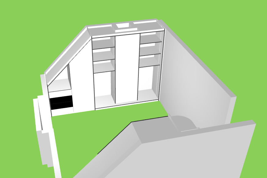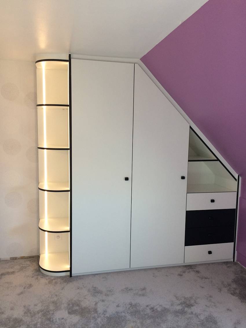 Aménagement d'une chambre mansardée avec des dressings comportant des portes coulissantes avec fermetures automatiques et portes ouvrantes ayant des charnières permettant une ouverture à 155°.