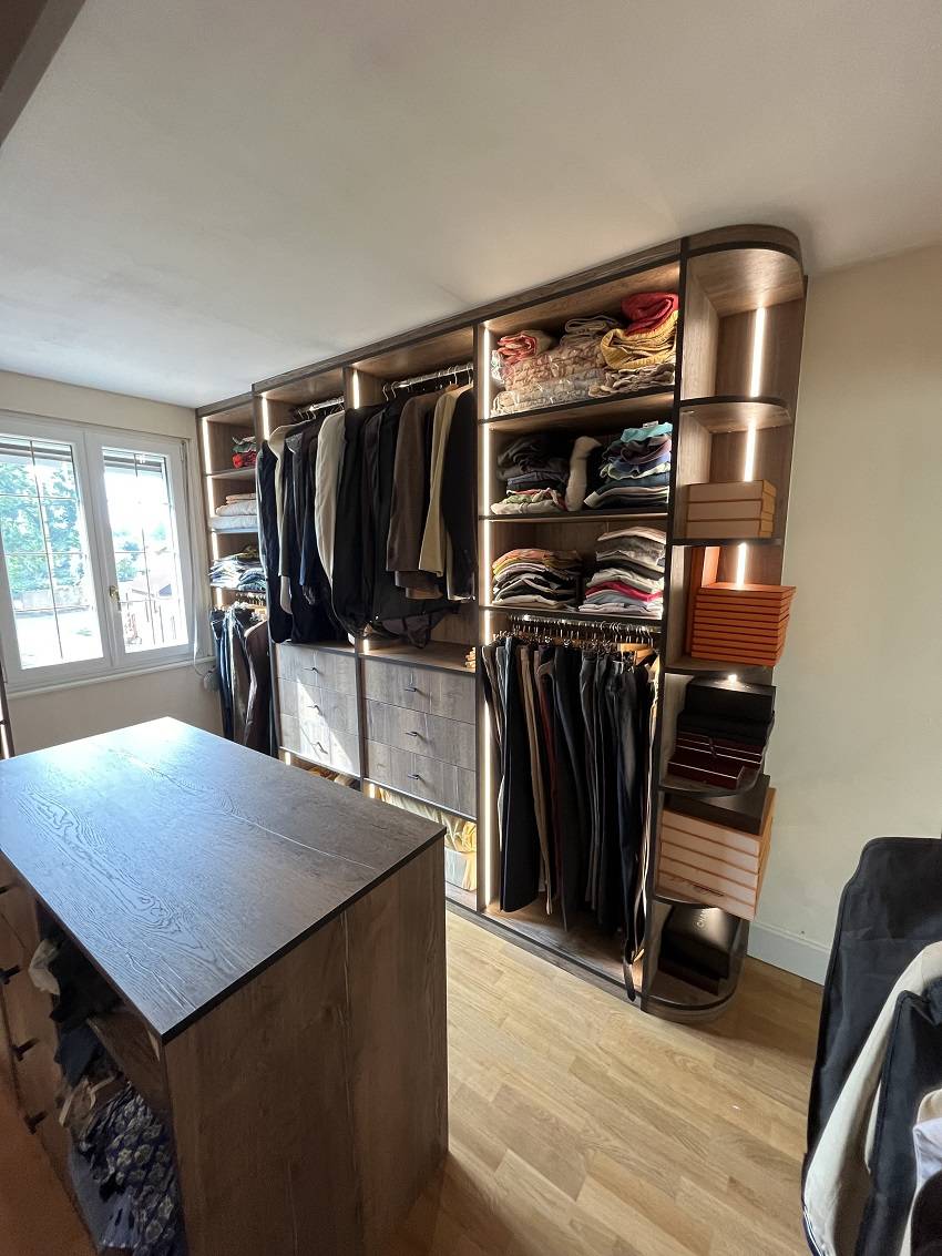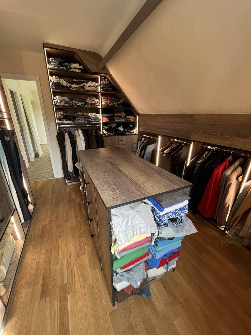 aujourd'hui dldp à réalisé un grand dressing en sous pente de couleur chêne halifax, 2 éléments en sous pentes, et 1 autre avec une colonne arrondie, éclairages LED sur les montants j'ai choisi du 24V, au centre de la pièce un ilot central pour optimiser au maximum l'espace, ce chantier à était posé à VERNEUIL SUR AVRE près de Conches en ouche dans département de l'Eure 27